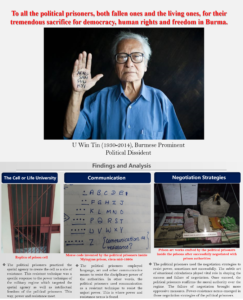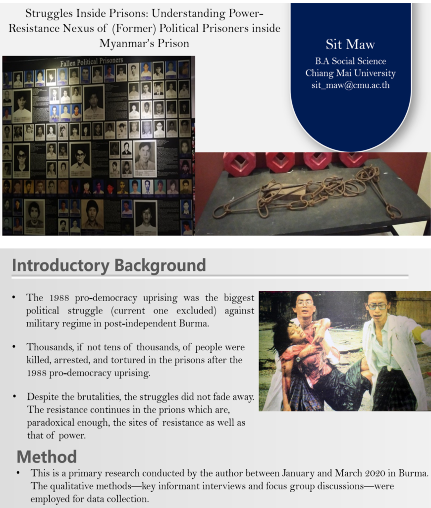Myanmar has been under oppressive military rule since 1962. People who challenge the power of the military regime were arrested, imprisoned, and tortured. However, the civil disobedience in Myanmar never fades away. In 1988, many students and general public alike marched on the streets asking to restore democracy in Myanmar. The well-known four eight (8.8.88) revolution was a nation-wide political struggle against oppressive socialist government which ruled the country almost twenty-six years since 1962. During and after the 1988 pro-democracy revolution, many students and activists faced widespread imprisonments due to their resistance against power of the military. As a result, thousands of political activists were imprisoned and faced the long prison sentences between 1988 and 2010. Aftermath of 1988 pro-democracy uprising, the prisons, paradoxically enough, had become the sites of resistance thereby engendering powerresistance nexus in the context of prison politics. How did the military government use the power technique to discipline the political prisoners? How did the political prisoners negotiate the power techniques by employing diverse forms of resistant strategies? Where did power and resistance meet? This study then argues that power and resistance are mutually constitutive reinforcing and undermining each other in the context of political prisoners in Burma. At the same time, the resistant strategies employed by the political prisoners against specific form of power are not independent of each other. They are simultaneously unique, local and context specific. The miscalculated resistant strategies faced the failure and even counterproductively encourage more oppressive measures affecting the wellbeing of political prisoners.
