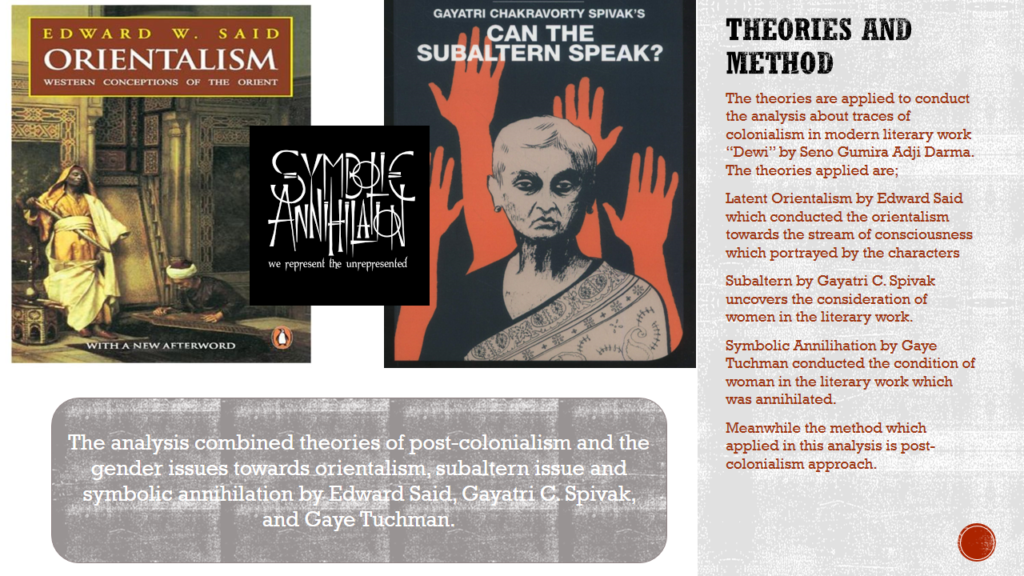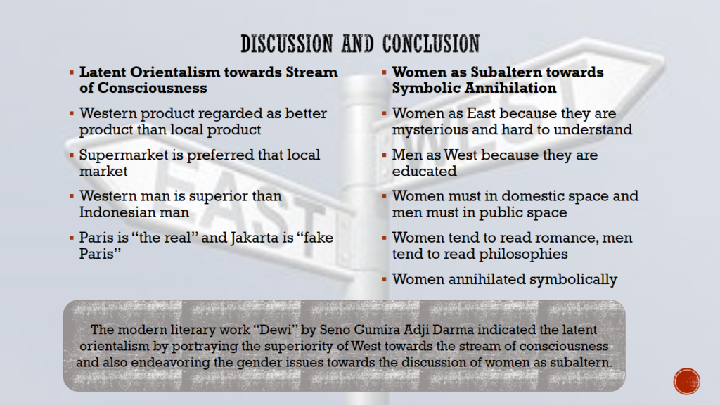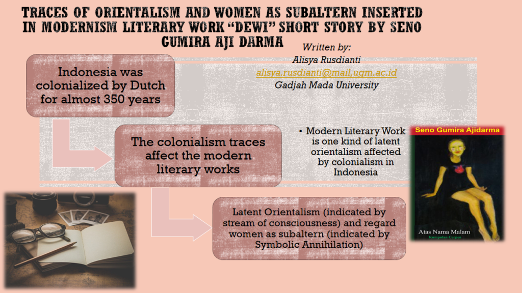 Indonesia is a country that has been colonized for 350 years by the Dutch and Japanese. The Dutch colonialism against Indonesia greatly influenced the thoughts of its citizens towards Indonesia itself. Indonesians still glorify Western countries as better countries than Eastern countries. In this case, the views about the West and the East that are very closely related to Indonesian citizens are shown by modern literary works written by Indonesians, such as the short story “Dewi” by Seno Gumira Ajid Darma. In this modern literary work, there are many points of stream of consciousness which show that the East is the dark side of the West, such as lifestyle, education, skin color, and so on. This consideration shows that citizens of former colonized countries have very orientalist thoughts, latent orientalism. Latent Orientalism (Edward Said) explains that thoughts that indirectly refer to the West are more powerful than the East. The short story not only shows the latent points of orientalism, but also shows the female side as a subaltern. Gayatri. C. Spivak initiated the theory of the Subaltern to argue that in this world there is always a superior and an inferior side. The work also shows that men in power are regarded as West and inferior women are regarded as East. This is indicated by the Symbolic Annihilation (Gaye Tuchman) points that occur to women in these modern literary works. In this research, qualitative research methods are applied to reach conclusions that clarify the results of the discussion. The results of the analysis that appear in this study are East consideration as the dark side of West, women as the East and Man as West, Symbolic annihilation is the sign of women as subaltern in ex-colonialized country, and the consideration of woman as East and man as West is the sign of latent orientalism and consideration of subaltern.