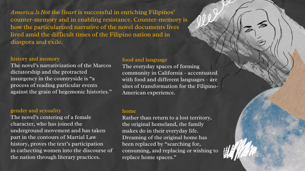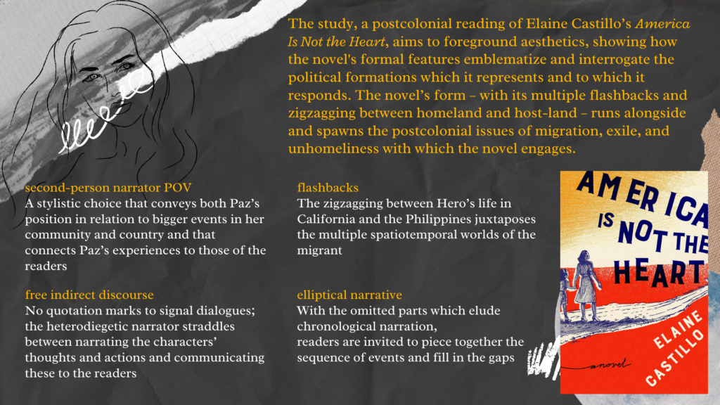 Literary studies, with the influence of critical theory inspired by Marxism and the Frankfurt School, have sidestepped concerns on aesthetics and poetics. Using Elleke Boehmer’s postcolonial poetics, this study aims to explore juxtaposition and asynchronicity in Elaine Castillo’s America Is Not the Heart. It discusses how juxtaposition and asynchronicity as postcolonial poetics interrogate the postcolonial politics in the novel and explains the novel’s contribution to enriching Filipinos’ counter-memory and in enabling resistance. The poetics of second-person narrator point of view, flashbacks, free indirect discourse, and elliptical narrative are ways through which the text has explored migrants’ efforts of forging and linking social relations in the interstitial spaces between homeland and host land. At the same time, the novel goes beyond essentialist contours of migrant experience such as heteronormative nationalism and nostalgia for lost origins. The paper demonstrates not only a critical reckoning with power structures but also renewed attempts and continued struggle, which lead to radical hope.
